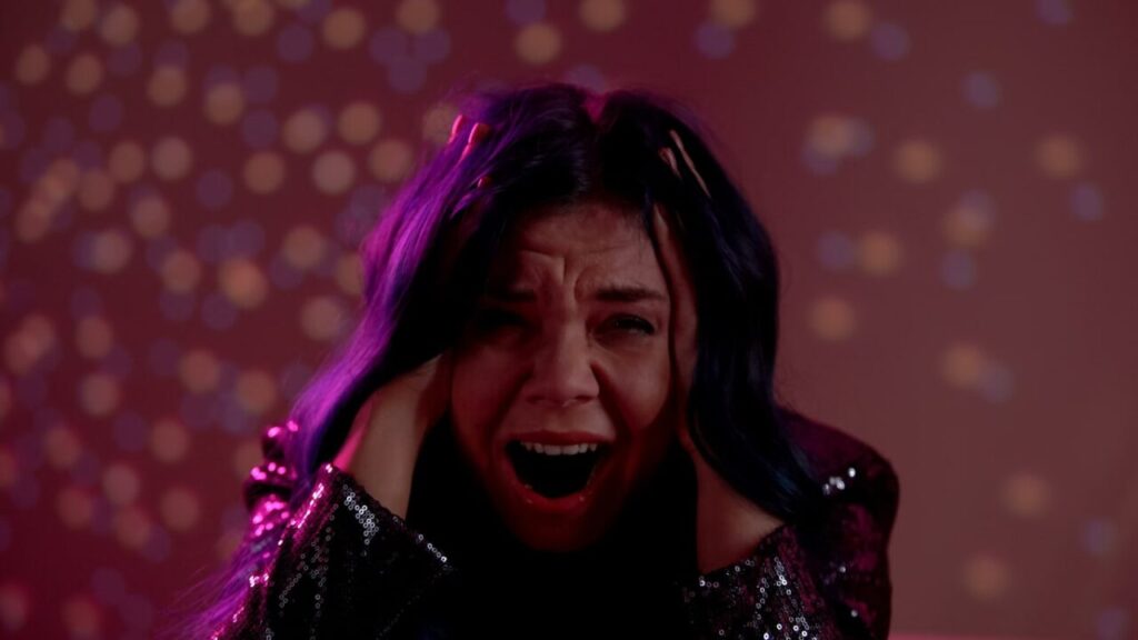 Scared young woman screaming, hallucinating after drug overdose at club party